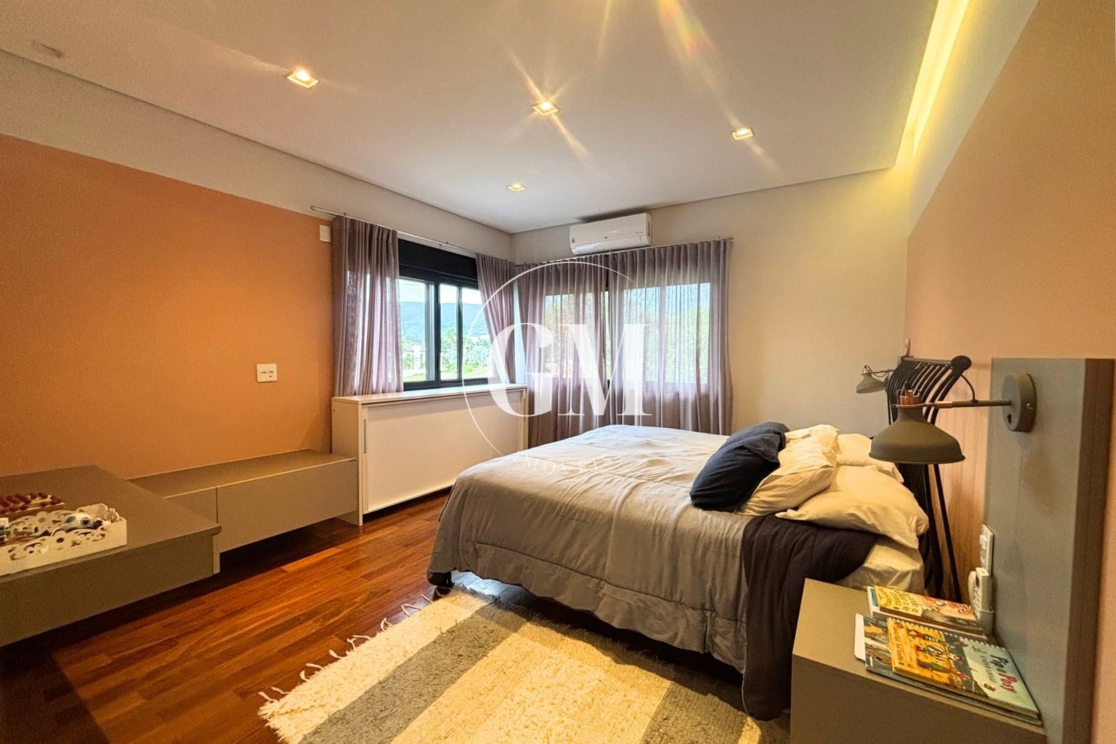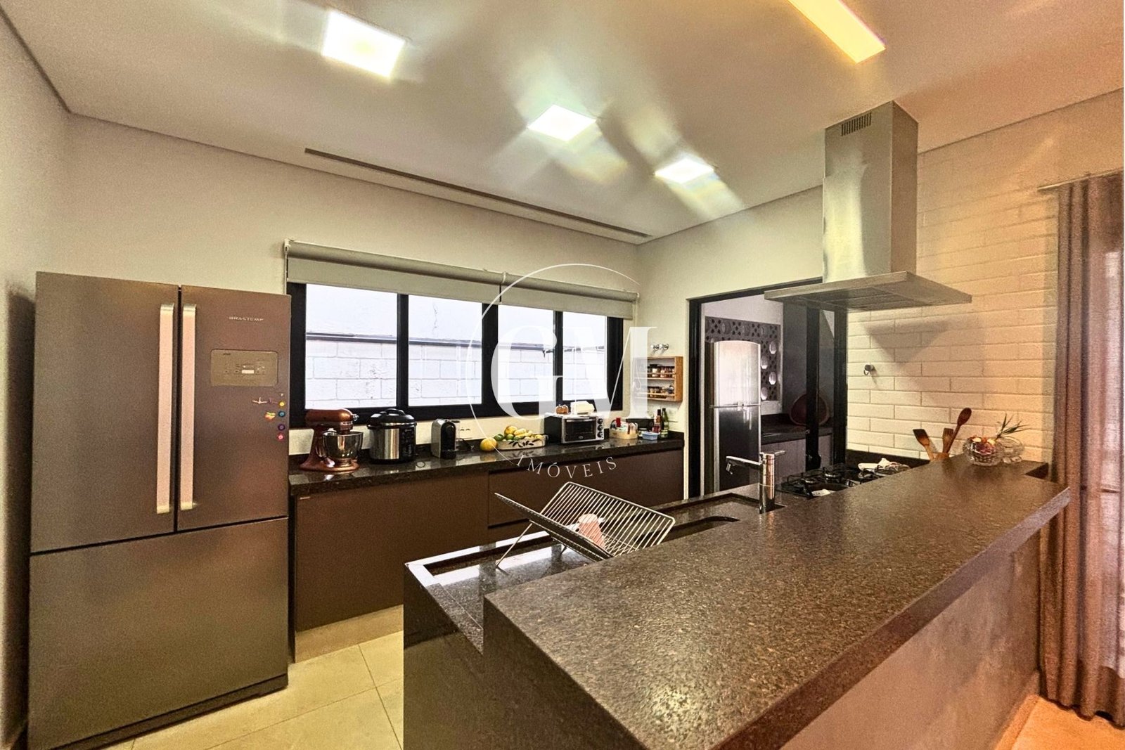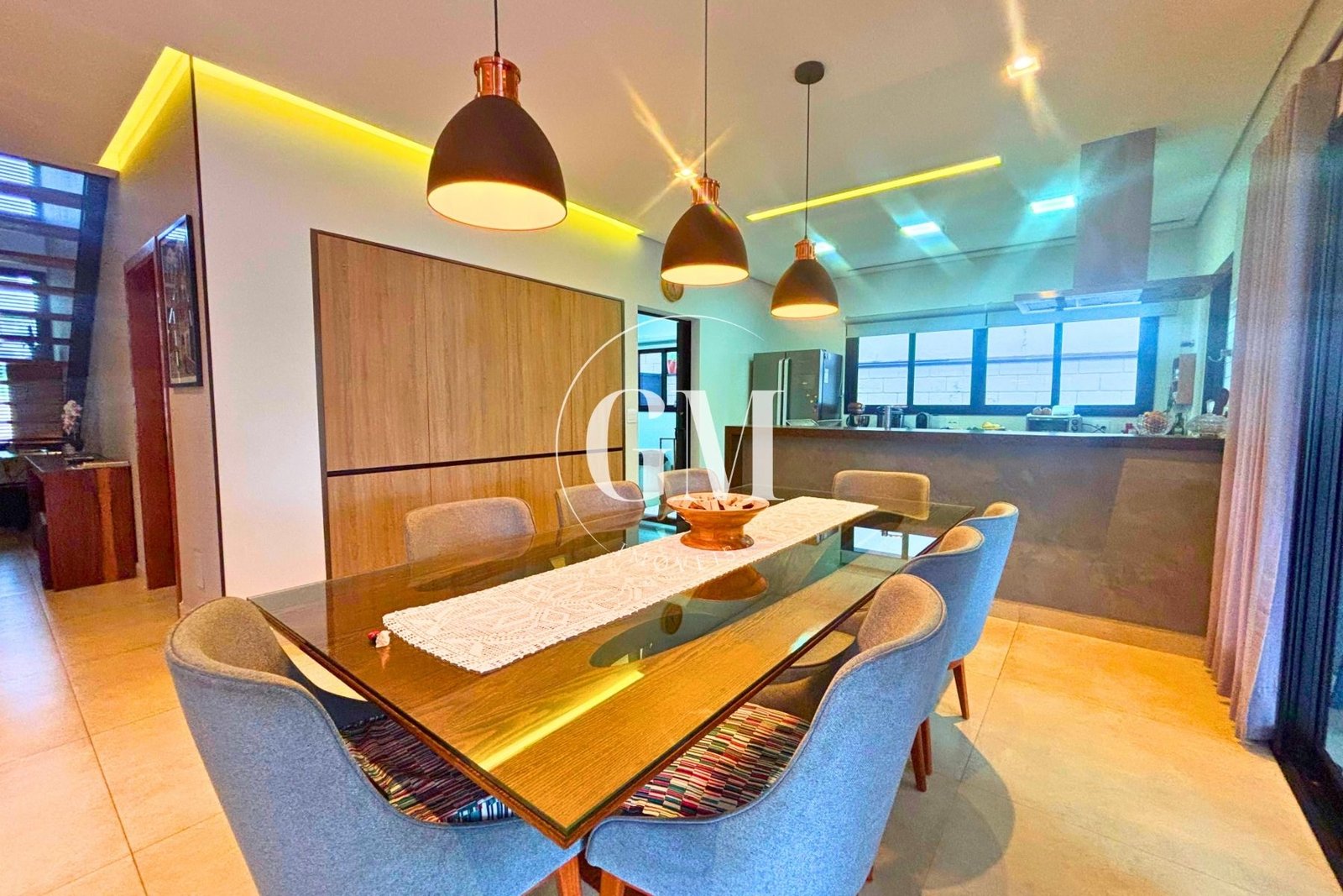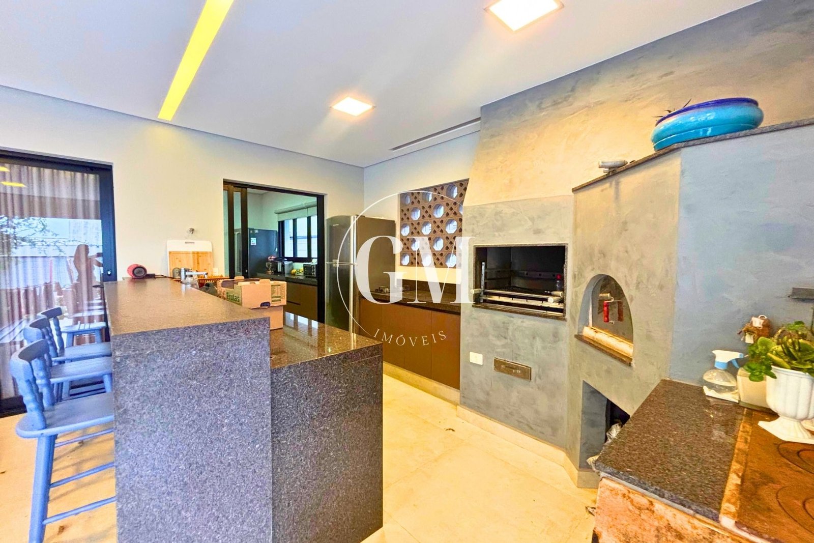 Os ambientes internos refletem um alto nível de acabamento e atenção aos detalhes. As bancadas da cozinha e do espaço gourmet são em granito Café Imperial, com acabamento polido e escovado, conferindo sofisticação e um visual diferenciado. A casa conta com marcenaria de alto padrão assinada pela Bontempo, todas as persianas automatizadas, ar-condicionado em todos os dormitórios e no escritório, além de piso de taco no pavimento superior, que adiciona aconchego e elegância à área íntima.