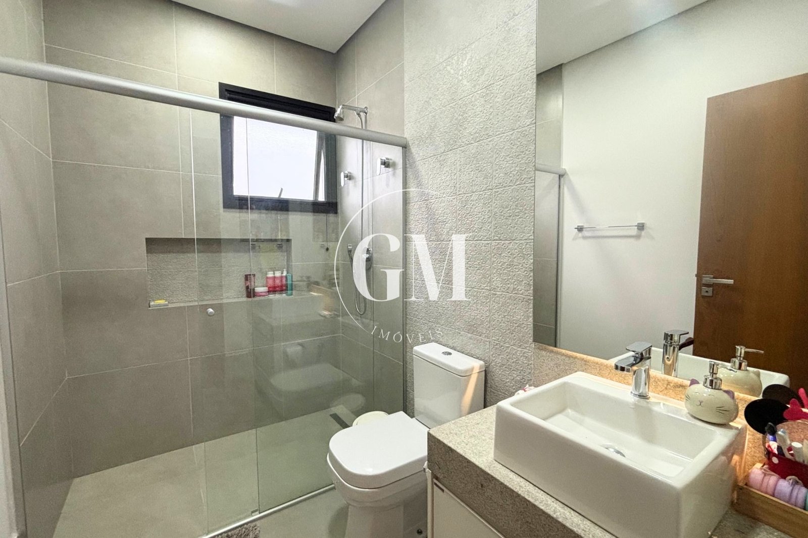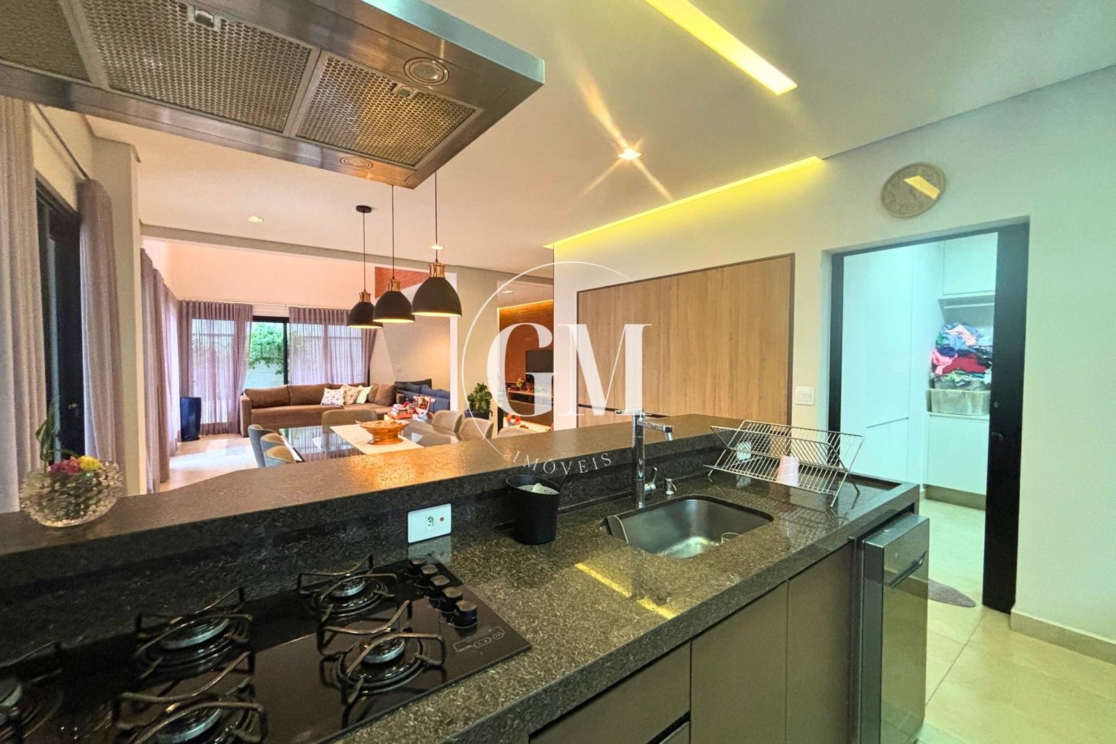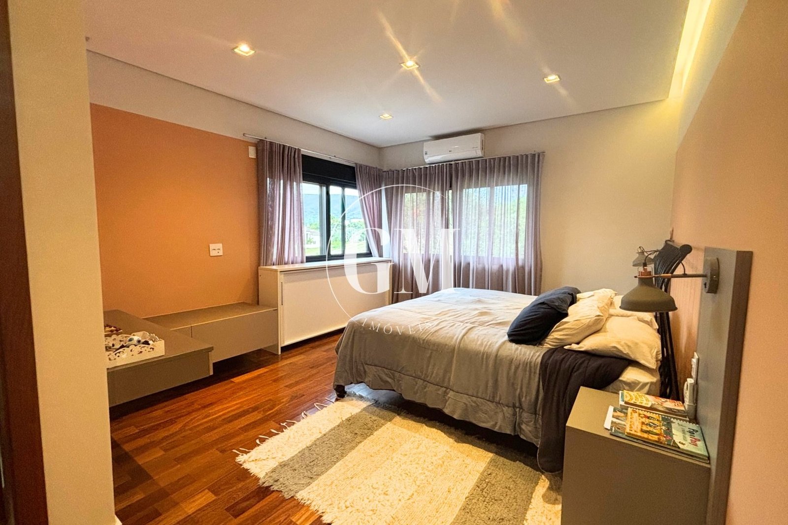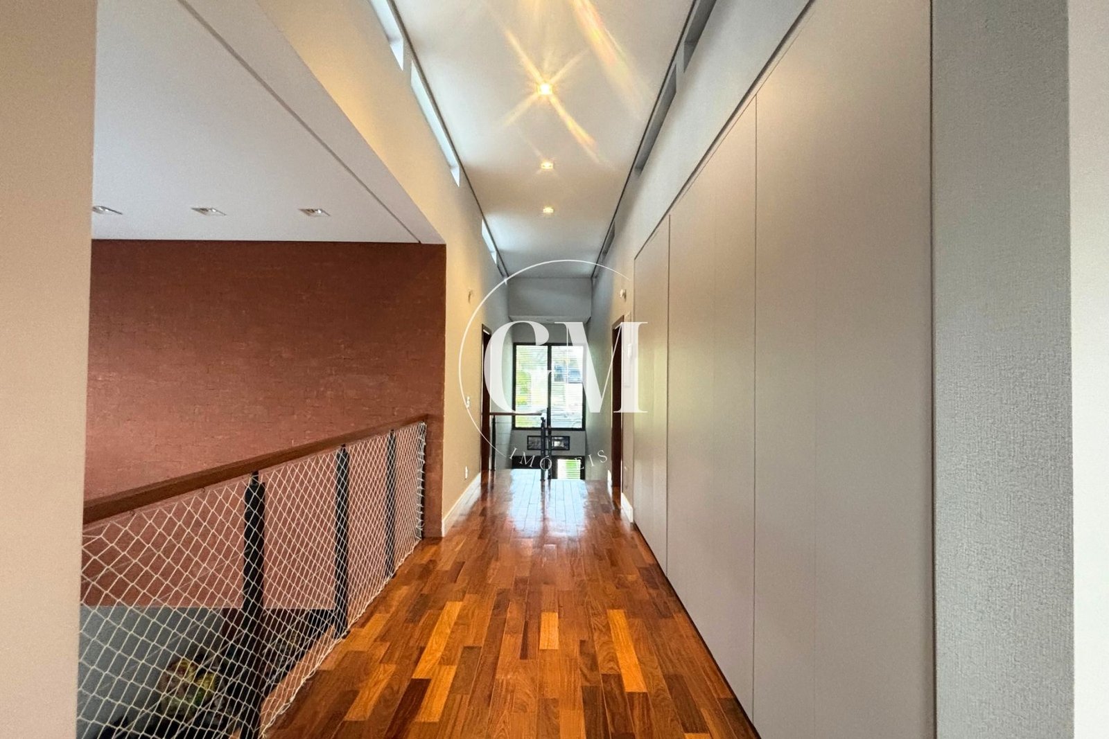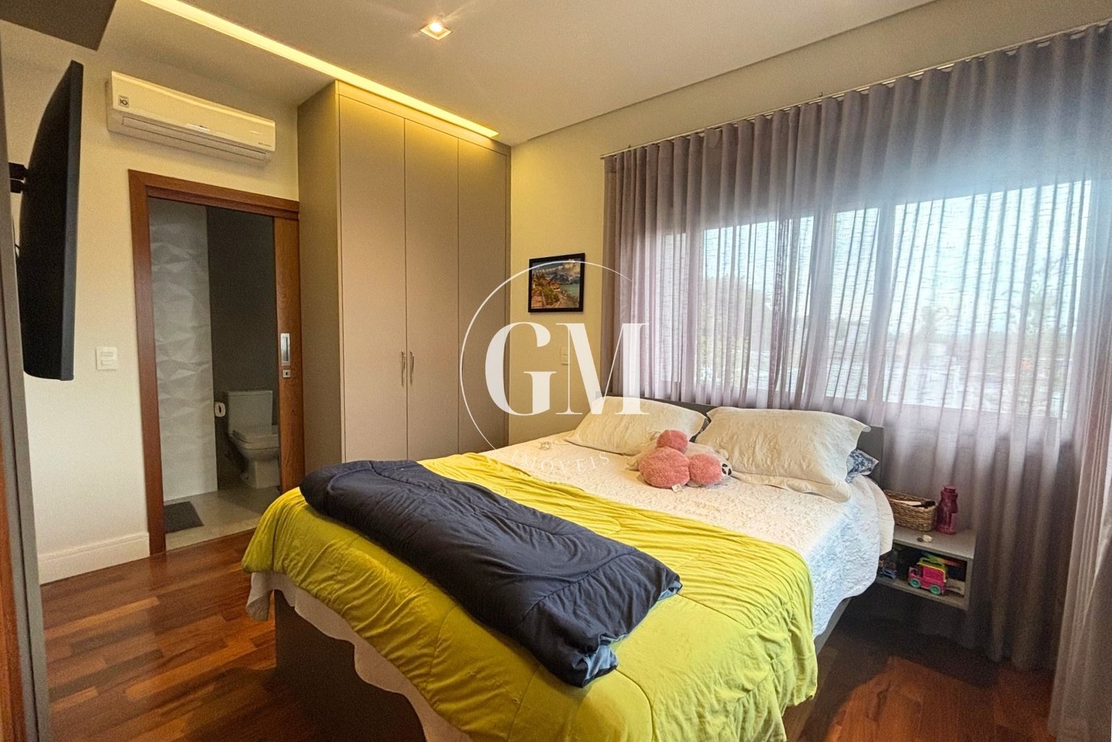 Os ambientes internos refletem um alto nível de acabamento e atenção aos detalhes. As bancadas da cozinha e do espaço gourmet são em granito Café Imperial, com acabamento polido e escovado, conferindo sofisticação e um visual diferenciado. A casa conta com marcenaria de alto padrão assinada pela Bontempo, todas as persianas automatizadas, ar-condicionado em todos os dormitórios e no escritório, além de piso de taco no pavimento superior, que adiciona aconchego e elegância à área íntima.
