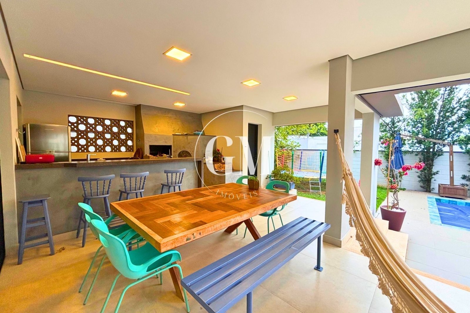 A área de lazer se destaca pela piscina com tratamento por ozônio, que oferece maior qualidade da água e reduz o uso de produtos químicos. O paisagismo traz identidade e afeto ao imóvel, com um pé de amora que acompanha a família desde 2013, jabuticabeiras no quintal e na calçada, além de árvores-de-fogo, que transformam o jardim com sua floração vermelha intensa.