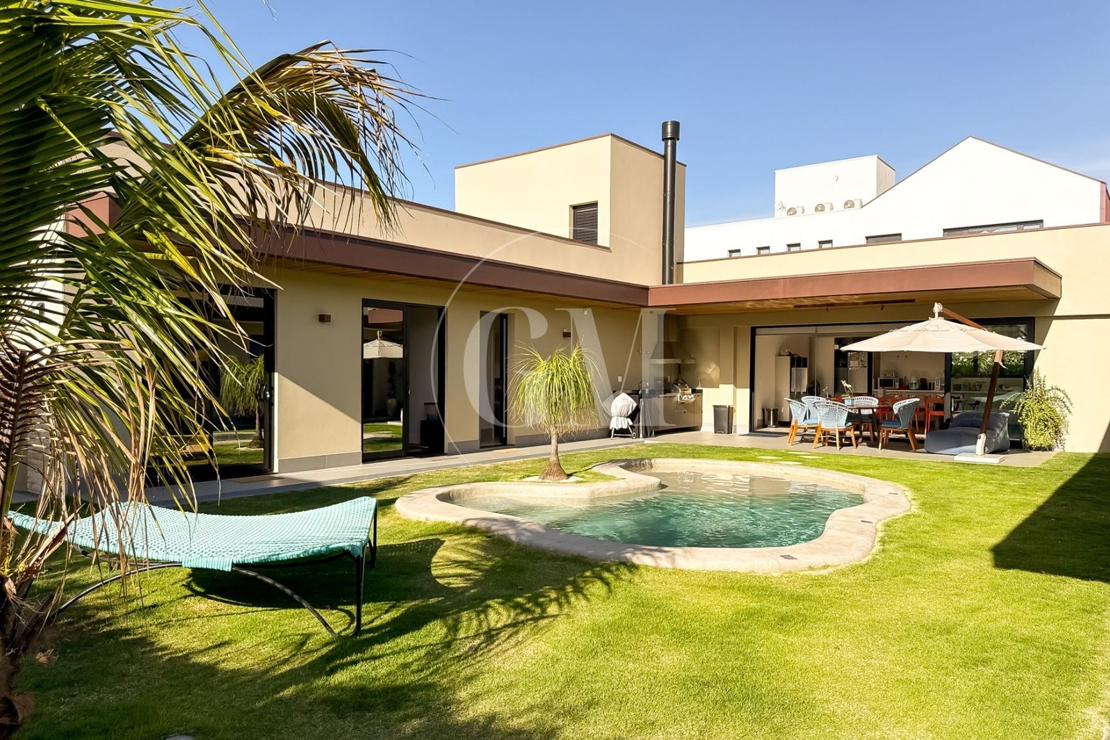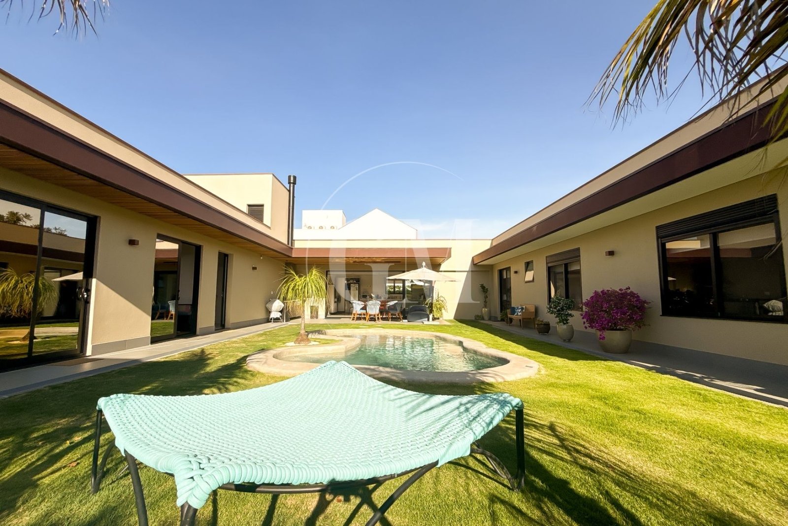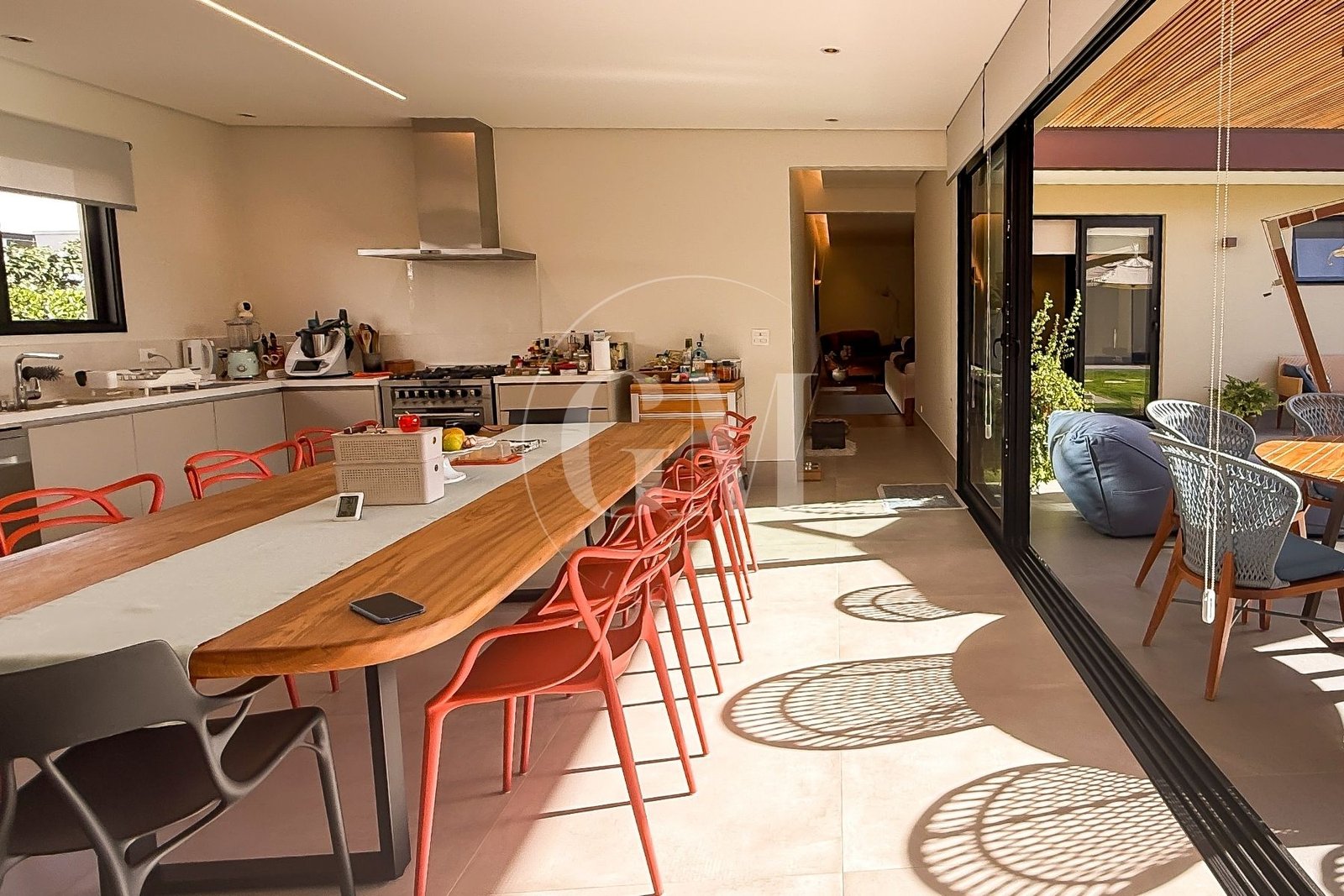 O projeto em formato de “U” separa os blocos da casa, garantindo privacidade e ao mesmo tempo fluidez entre os espaços. Além disso, a integração entre sala, cozinha e área gourmet cria ambientes perfeitos para momentos de convivência. Assim, cada detalhe foi pensado para unir funcionalidade e sofisticação.