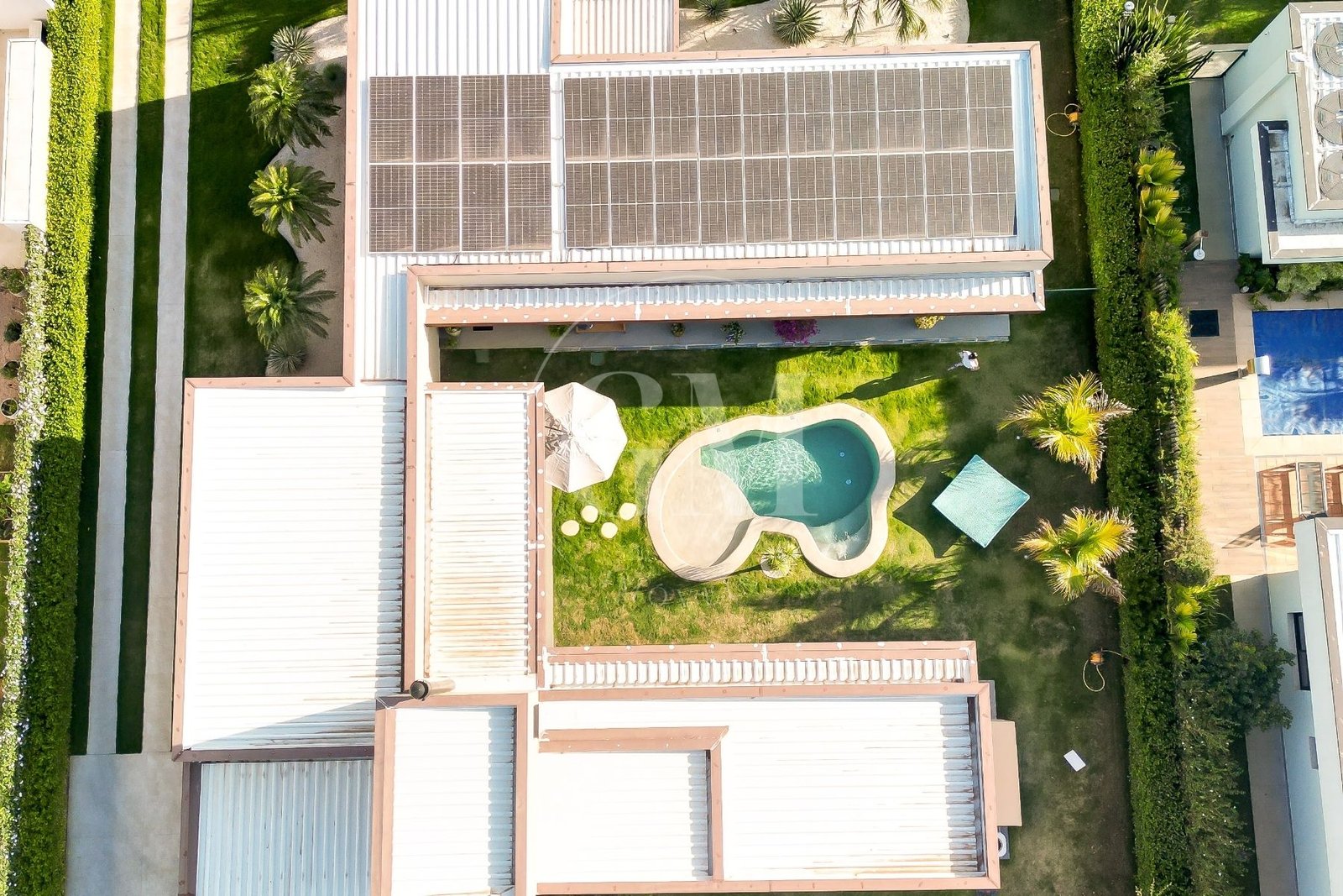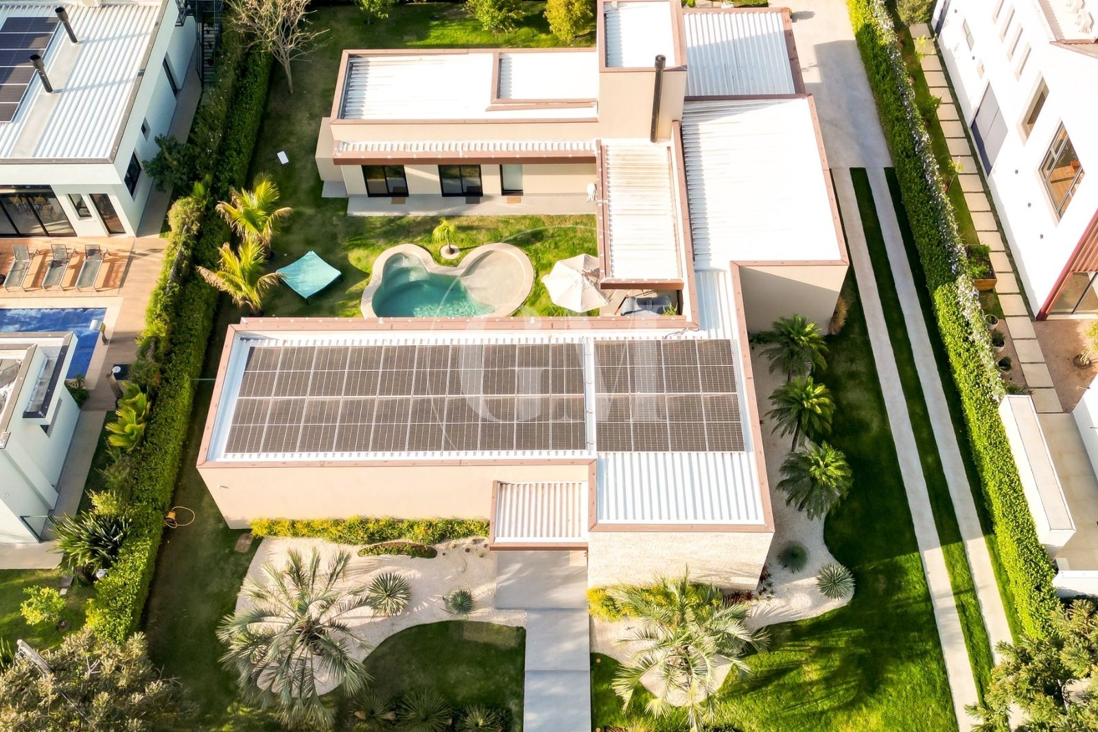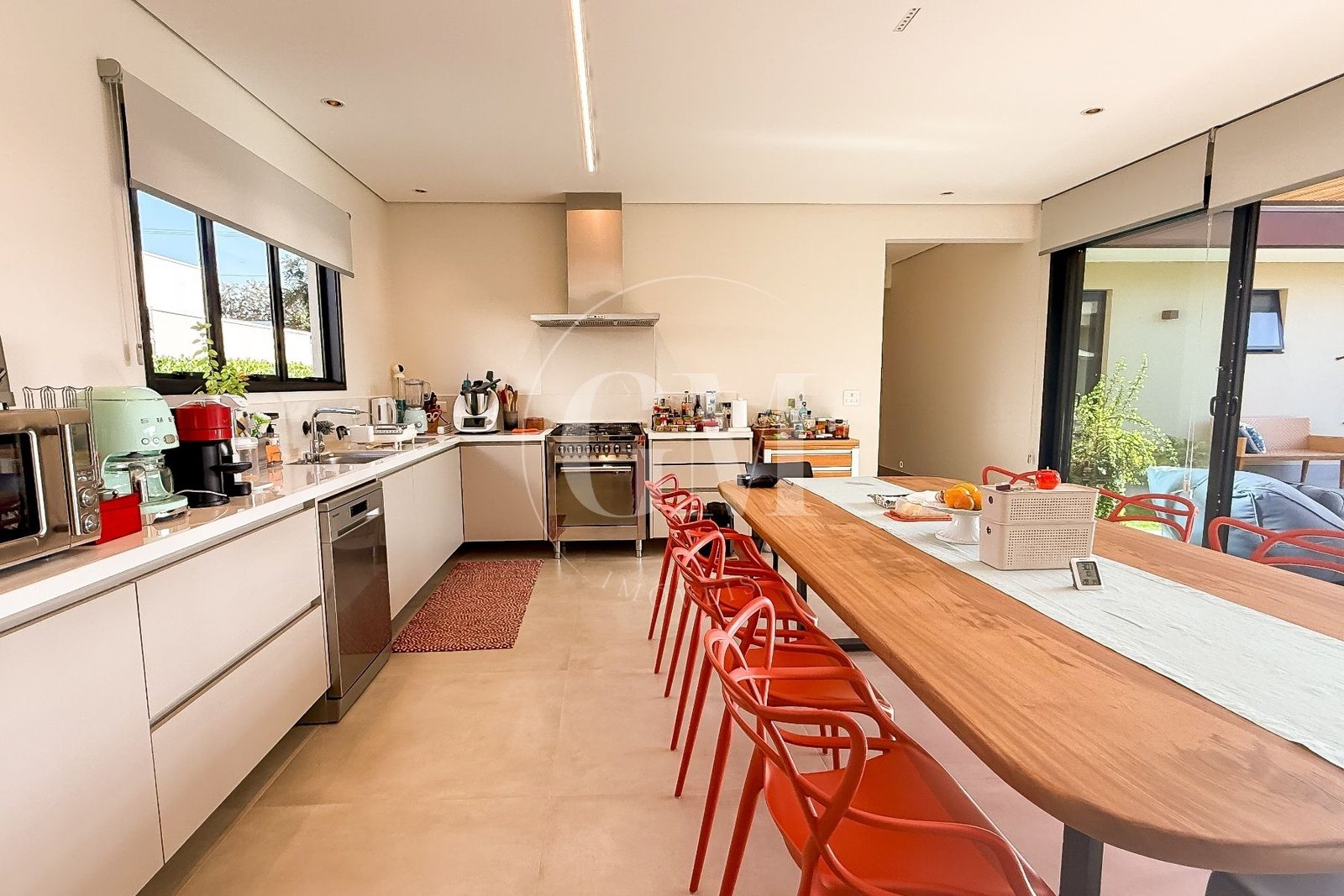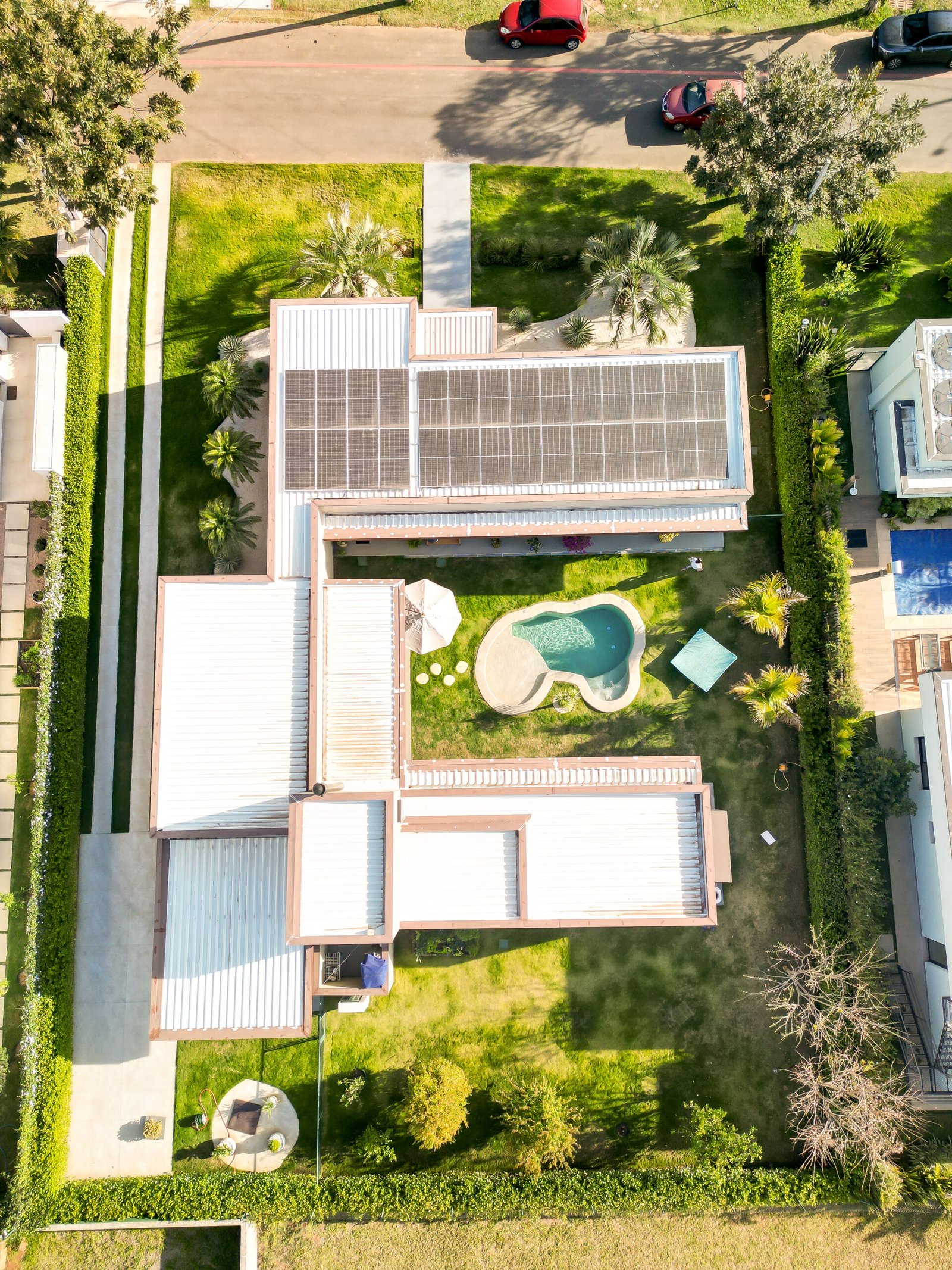 O projeto em formato de “U” separa os blocos da casa, garantindo privacidade e ao mesmo tempo fluidez entre os espaços. Além disso, a integração entre sala, cozinha e área gourmet cria ambientes perfeitos para momentos de convivência. Assim, cada detalhe foi pensado para unir funcionalidade e sofisticação.