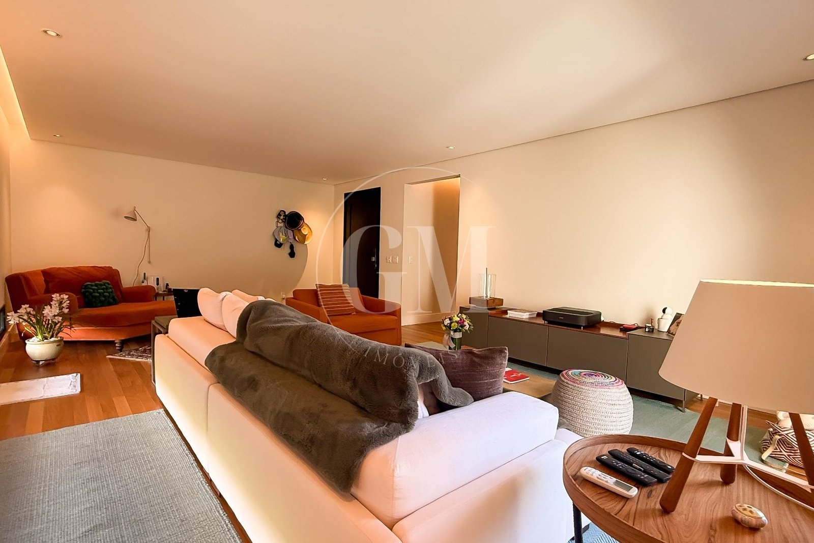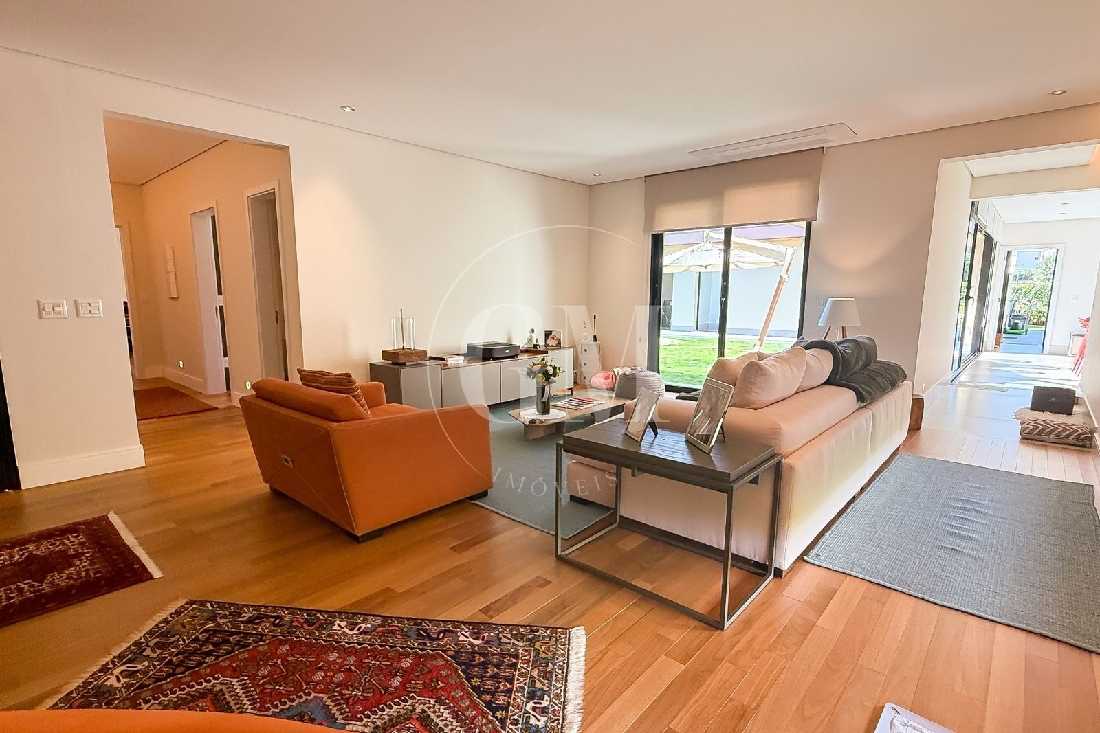 Sala de estar iluminada com ambientes integrados